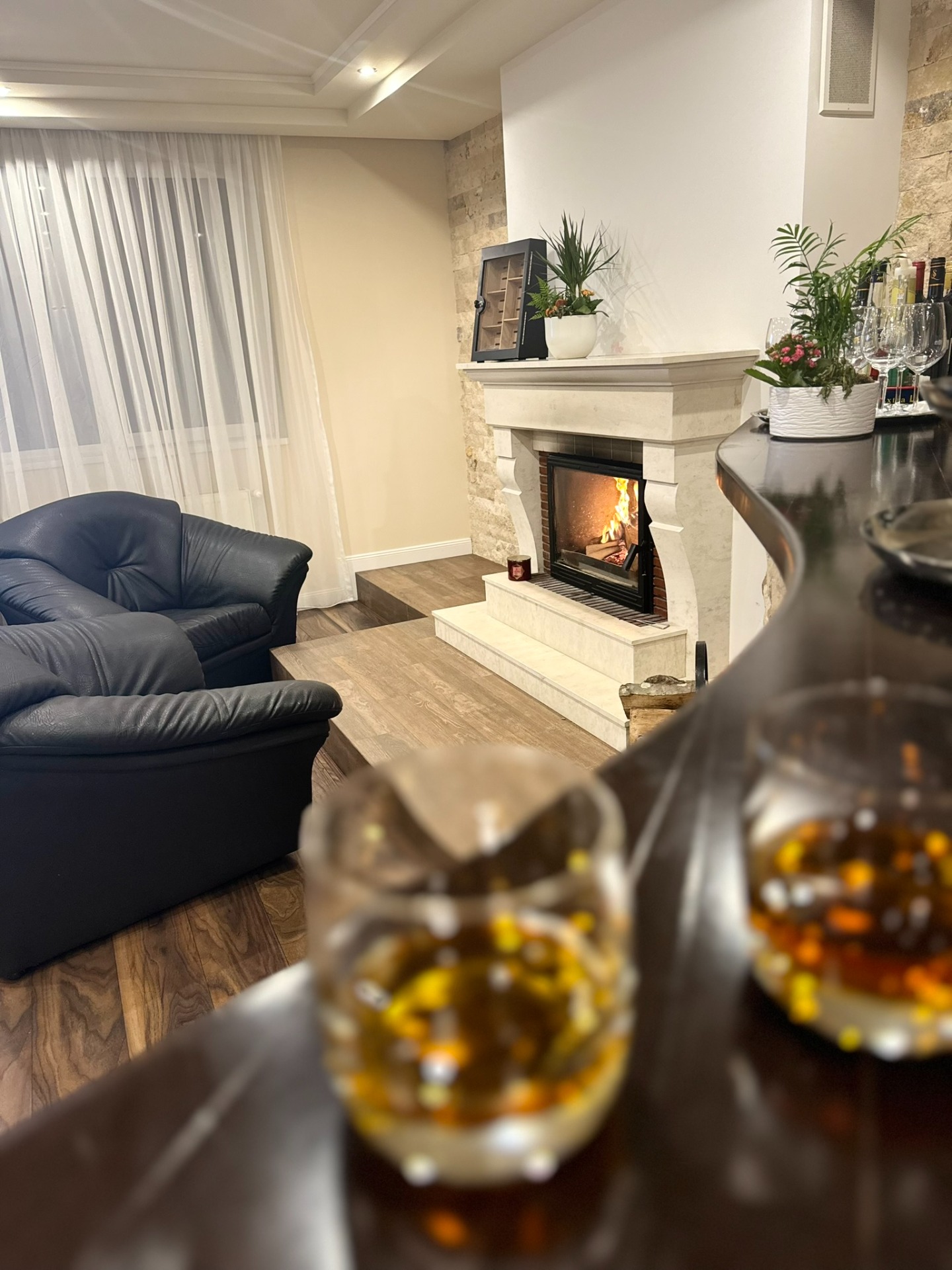 - Living cu semineu, bucatarie complet utilata, terasa pentru fumatori.